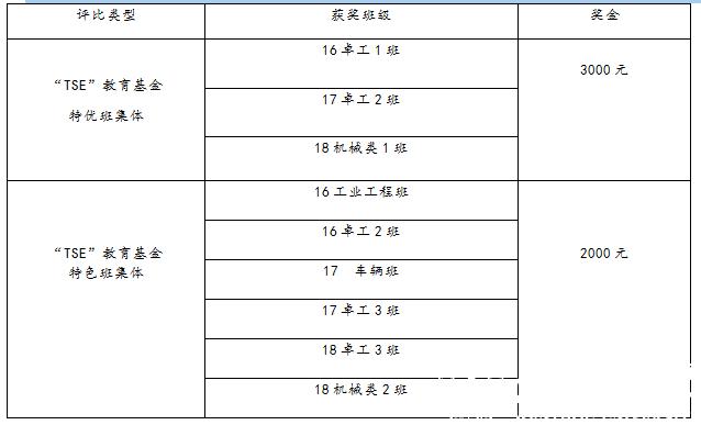 “TSE”教育基金由宁波兴茂电子科技有限公司出资设立,特别设置了特优班集体和特色班集体奖项。特优、特色班集体评比涉及学风建设、学生团建、科技竞赛、创新创业、考级考证、新闻宣传以及考研就业七个特色项目。经过前期各班申报、年级委员会初评、学院资格审核和学院联评大会,并由教师评委和学生评委投票,最终评选出16卓工1班、17卓工2班、18机械类1班3个特优班集体和16卓工2等6个特色班集体。名单如下: