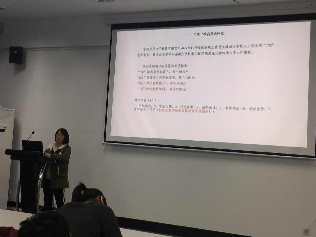随后发言的是学生科孙双老师。孙双老师的发言总结了上学期各班的考试通过率、科研竞赛成果。她同时就TSE奖学金设置以及评比方法,学院和班级学习标兵评选、学校优良学风班级立项进行了详细讲解。她在最后对科技之光活动月闭幕式暨年度颁奖典礼做了具体部署。最后发言的是徐沁怡老师。她首先补充了早晚自习请假制度。然后她强调了开学以来学院学风检查情况。