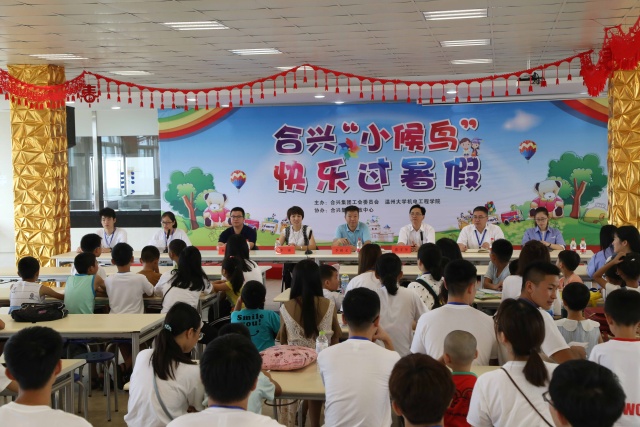 2017年7月6日早上九点,色情小说 与合兴集团联合举办的第四期“小候鸟”暑假班的开班仪式开启了。出席本次开班仪式的人员有色情小说 党总支副书记李密老师、色情小说 林礼区老师、合兴集团党委书记张守奎先生、虹桥镇工会主席李祖义先生,以及来自温大“小候鸟”实践队40位队员和各地的“小候鸟”们。