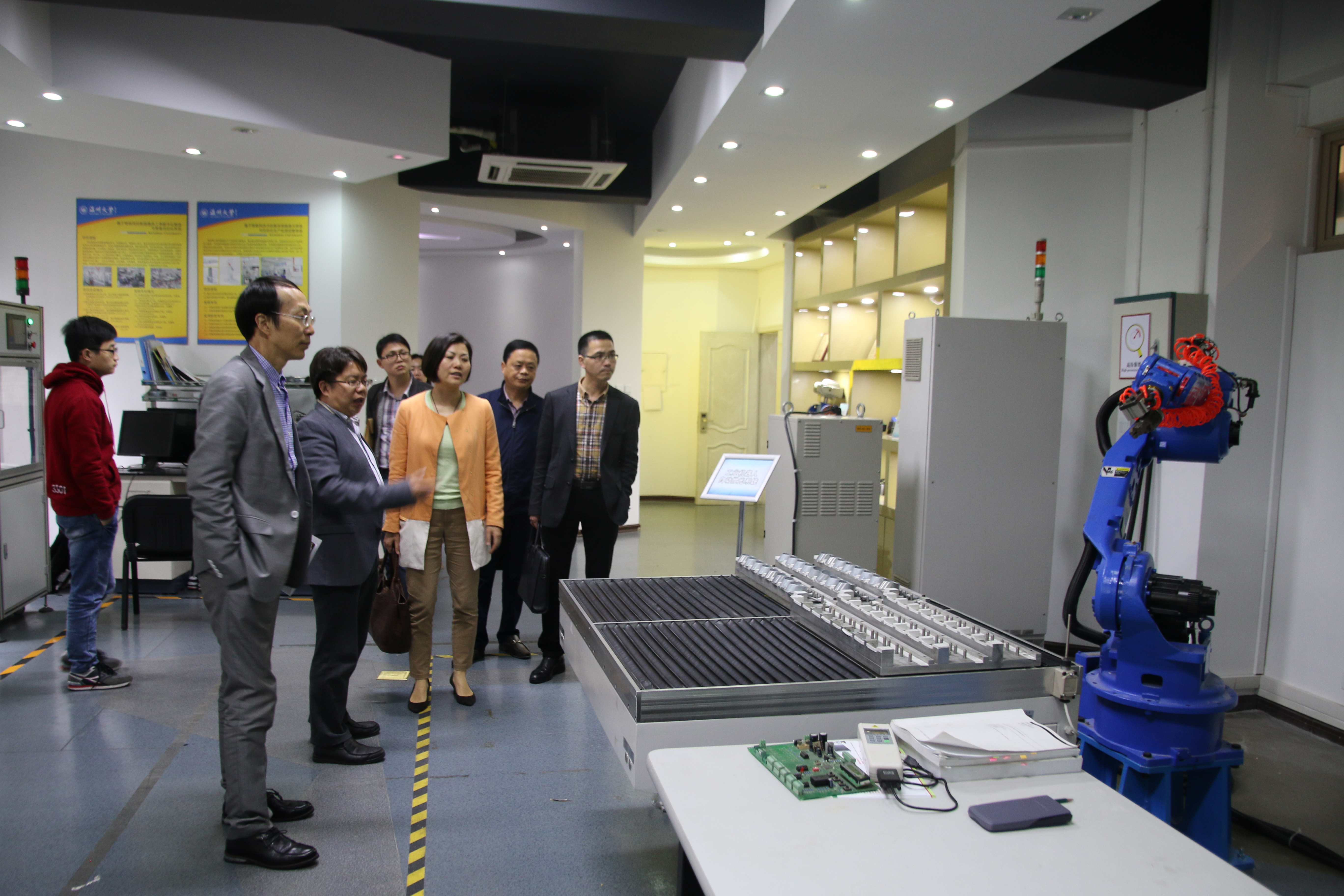 在考察、参观过程中,周宏明院长向来宾介绍了学院的科技部激光加工机器人国际合作基地和浙江省激光加工机器人重点实验室的情况以及学院的科研成果、与地方产学研合作情况。林朝朝副县长对基地的先进设备和科研项目表示了浓厚兴趣,她同时表示,希望能与学院加强产学研合作,共同促进苍南县科技发展工作。