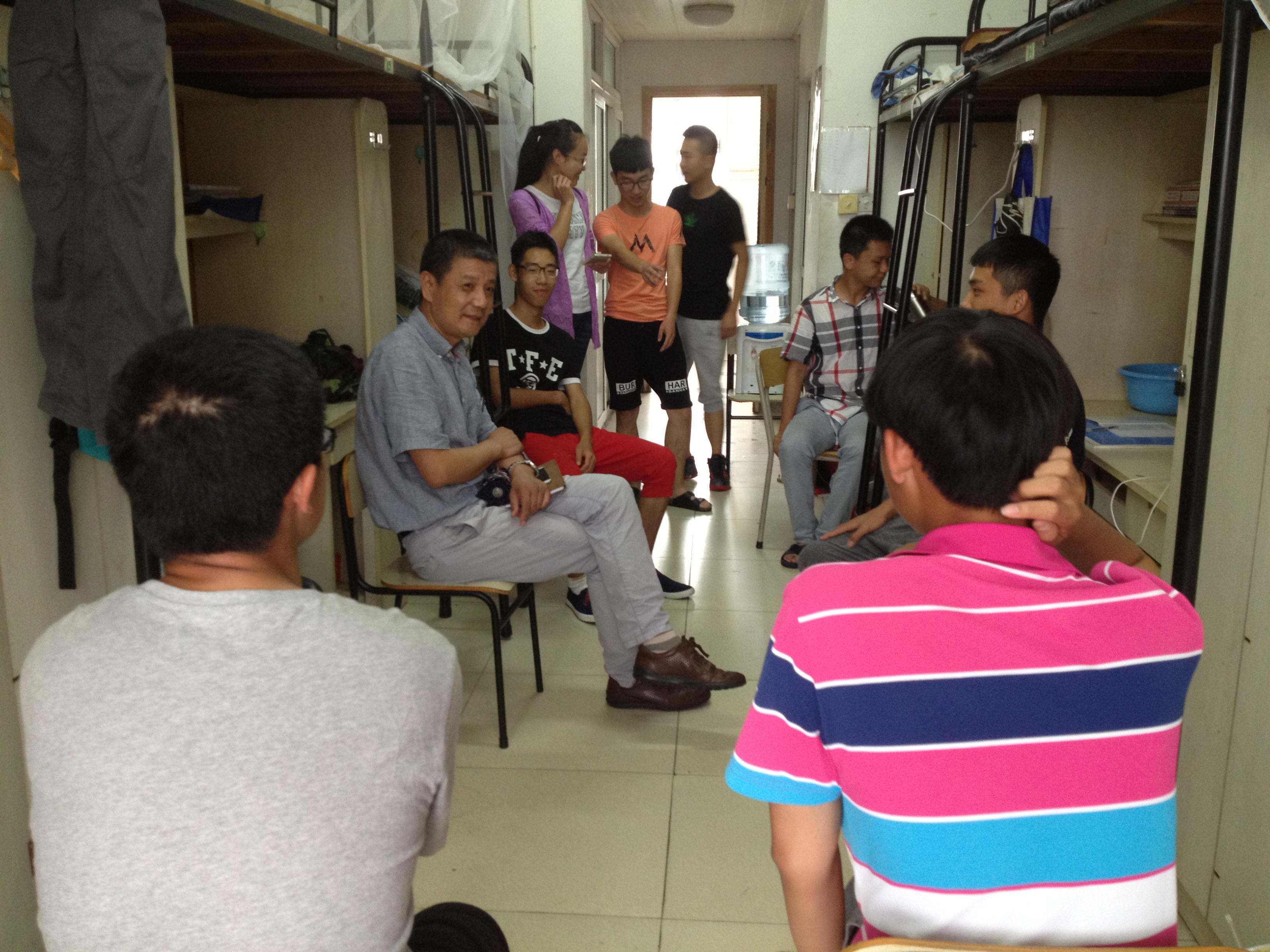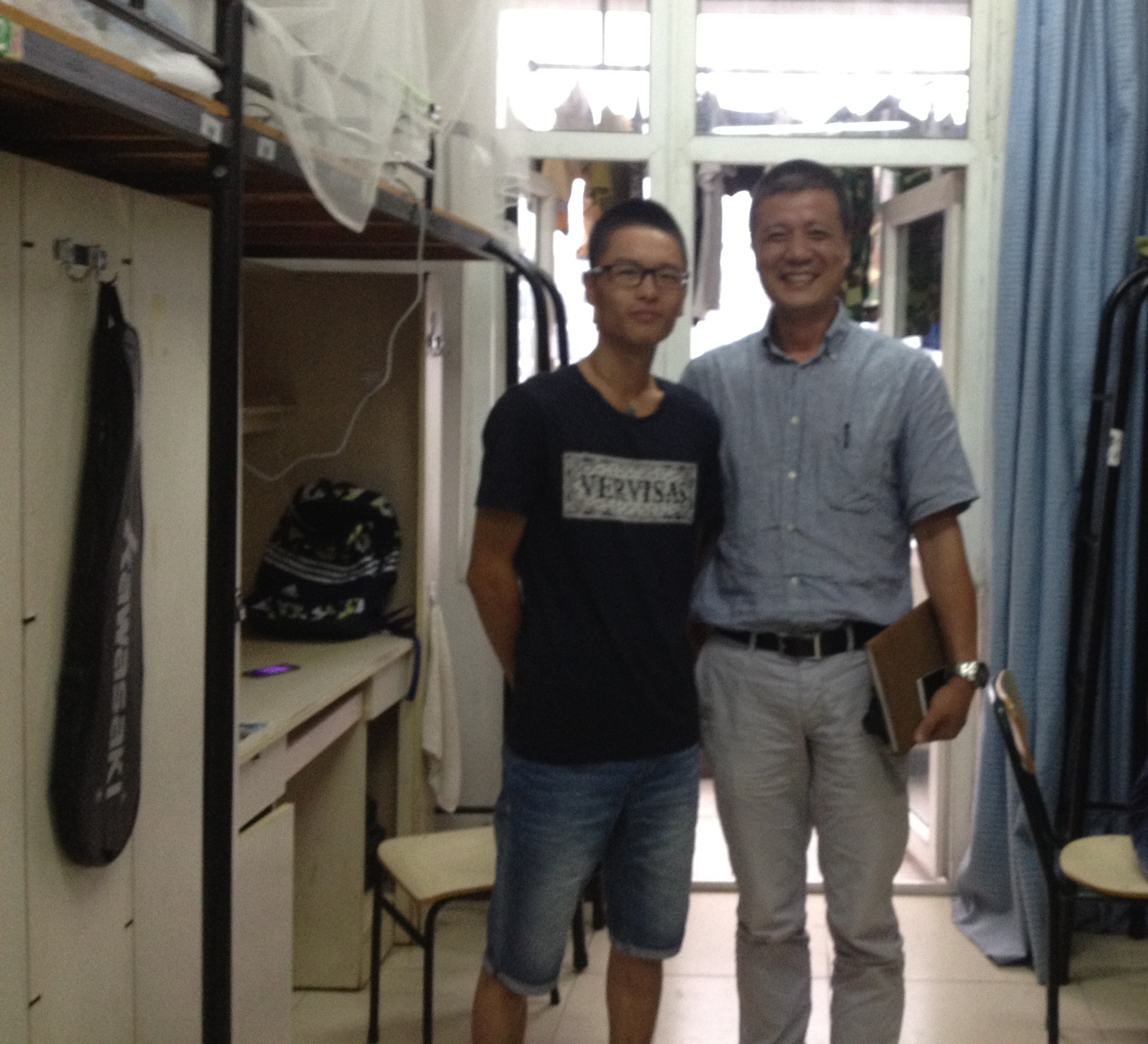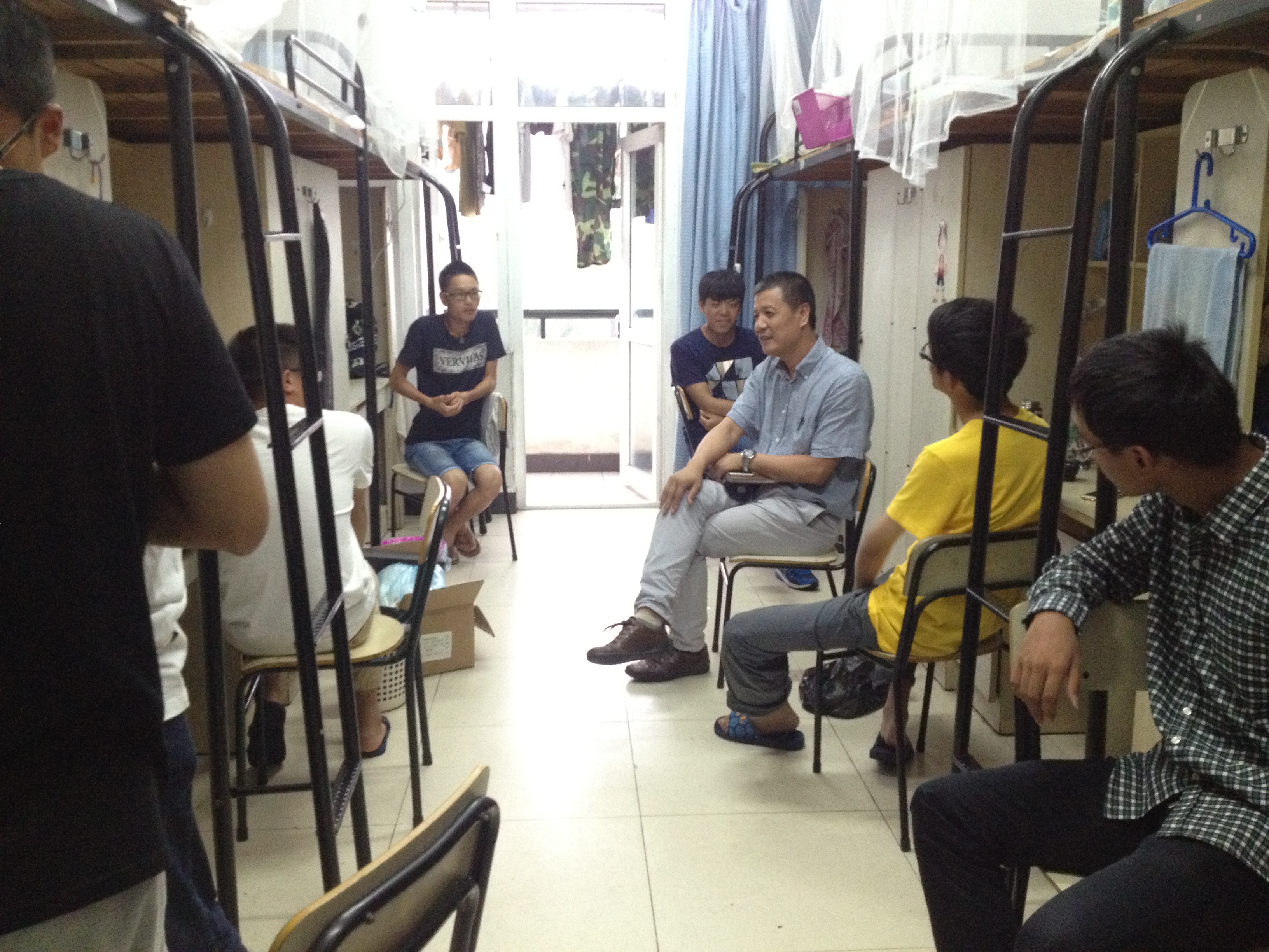 周书记关切地询问同学们饮食是否习惯,并和同学们聊起当地的一些特色美食,共同的话题很快拉近了与同学们的距离。在交谈过程中,周书记和同学们从军训中的趣事、课余生活的安排聊到对专业的感悟、对未来的设想。周书记告诉大家,专业是首要任务,是重要载体,要在学好专业的基础上,多涉猎文史、社会之类的书籍,增加人文修养,提高自身综合能力;读书是一种生活方式和态度,要多读书,学会读书;大学的学习是一种自主学习,更要学会一种思维方式;在遇到困难时,不要退缩和放弃。在走访寝室的过程中了解到的部分新生已经去了图书馆和提前预习现象,周书记开心的给予了肯定。值得一提的是,当周书记走到一个寝室时,一个男生马上站立起来,热情地与周书记握手,原来暑期学院领导为新生送录取通知书时,周书记正是辗转一天,为这位来自建德市大同镇禹甸村的考生王忠孝送上了鲜红的录取通知书。两人开心地合影留念,相机定格下珍贵的记忆。