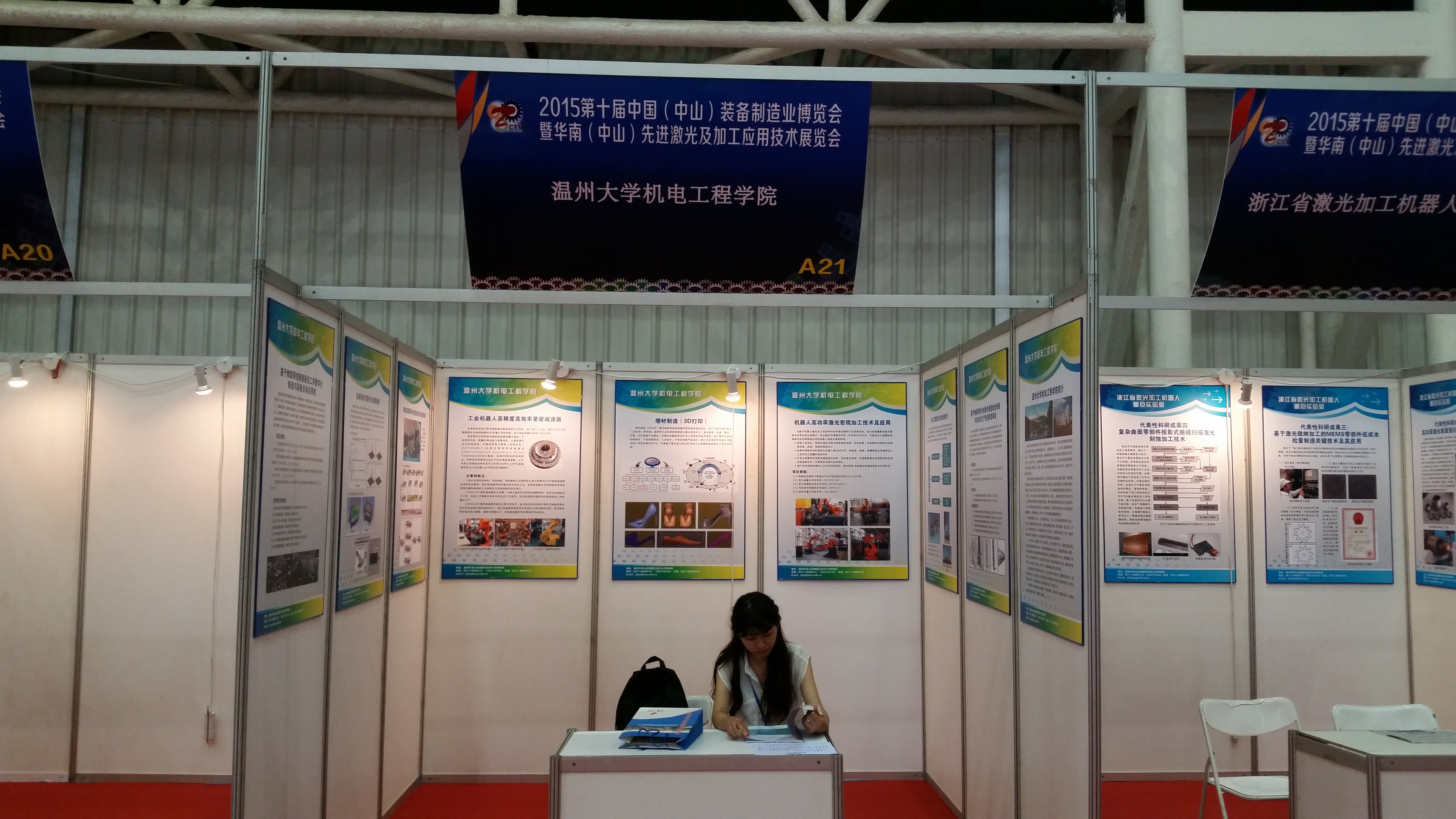 2015华南(中山)先进激光及工应用技术展览会在中山火炬国际会展中心举办,由中山市政府与激光加工专业委员会携手共同打造,来自世界各地的行业翘楚对最新科技等进行了展示。展示范围主要包括激光器和光导发光元件、激光加工系统、光学信息技术与光通信技术等。色情小说 分别以学院和浙江省激光加工机器人重点实验室为单位进行了两个展位共18块展板的展示。展示内容主要包括机器人高功率激光宏观加工技术及应用、在线监测、增材制造(3D)打印、工业机器人、物联网等多个方面的研究进展,取得了广泛关注,并与多名企业代表和研究人员进行了相关交流。