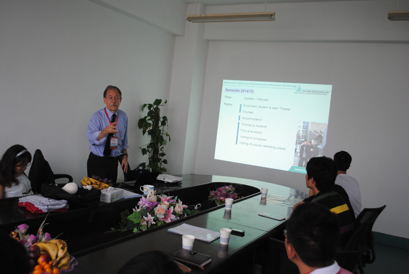2013年5月19日下午,色情小说 在6C401会议室举行了一场德国耶拿应用技术大学“机械电子学”项目的专场交流座谈会。即将于今年10月赴德参加该项目的同学与来温参加我校80周年校庆活动的德方项目负责人Peter Dittrich教授进行了热烈的交谈。Dittrich教授向同学们介绍了耶拿应用技术大学的地理位置、专业及所学课程的一些基本情况。同学们表现出浓厚的兴趣,纷纷用英语向教授详细询问了当地的风土人情、生活学习等方面的细节问题,对即将进行的海外学习生活充满憧憬,气氛非常热烈。另外,学院相关负责老师周晨、李勇、钟蓉以及2012年参加过该项目的部分同学也参加了此次会议。