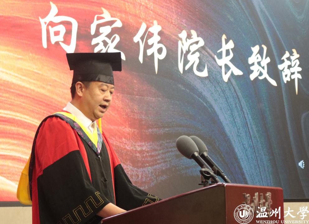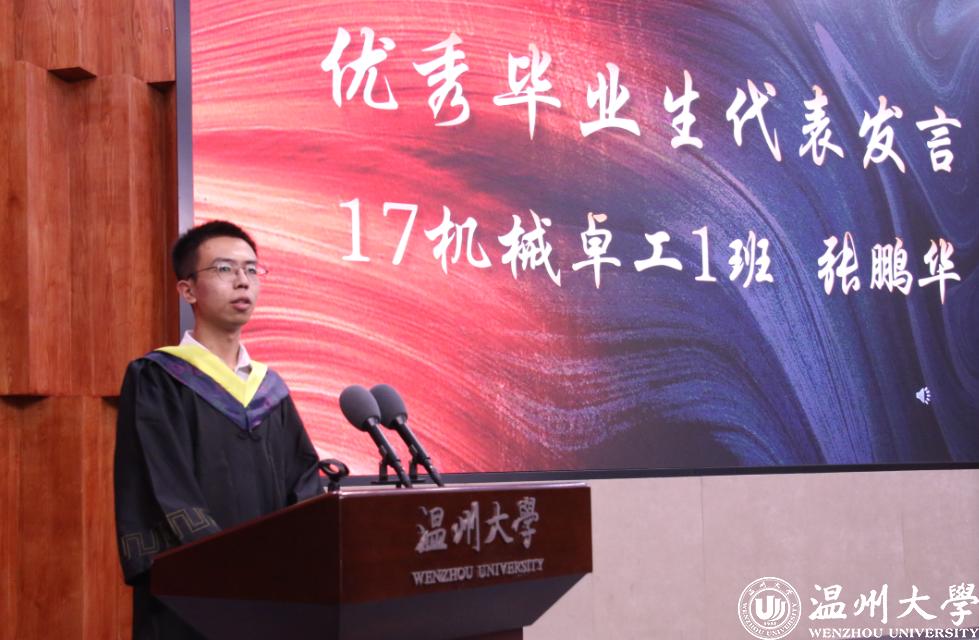 张鹏华同学代表学院全体毕业生发言,他对所有师长们无微不至的关怀与帮助表达了衷心的感谢。“回首往事,感慨万千。四年的时间,1400多个日夜,温大的角角落落都留下了我们成长的足迹。在学习上,上课时虽偶有犯困走神,但这并不影响我们对知识的渴望;晚上考研自习室灯火通明,是大家努力奋斗的证明;运动场上,我们挥洒汗水,拼搏争先,尽显青春率性。”他感恩在温大收获的师生情义和同窗之谊,并说道,四年的大学生活给他带来了巨大的改变,从初入学时对未来的不确定,到如今坚定了自己的理想信念,这是求学路上不断探索、坚持的结果。“逝者如斯夫,不舍昼夜,我们的大学生活将拉上帷幕,但我们的生存之路才刚刚开始。”大学毕业不是终点,而是人生历程的另一个起点,道阻且长,行则将至。