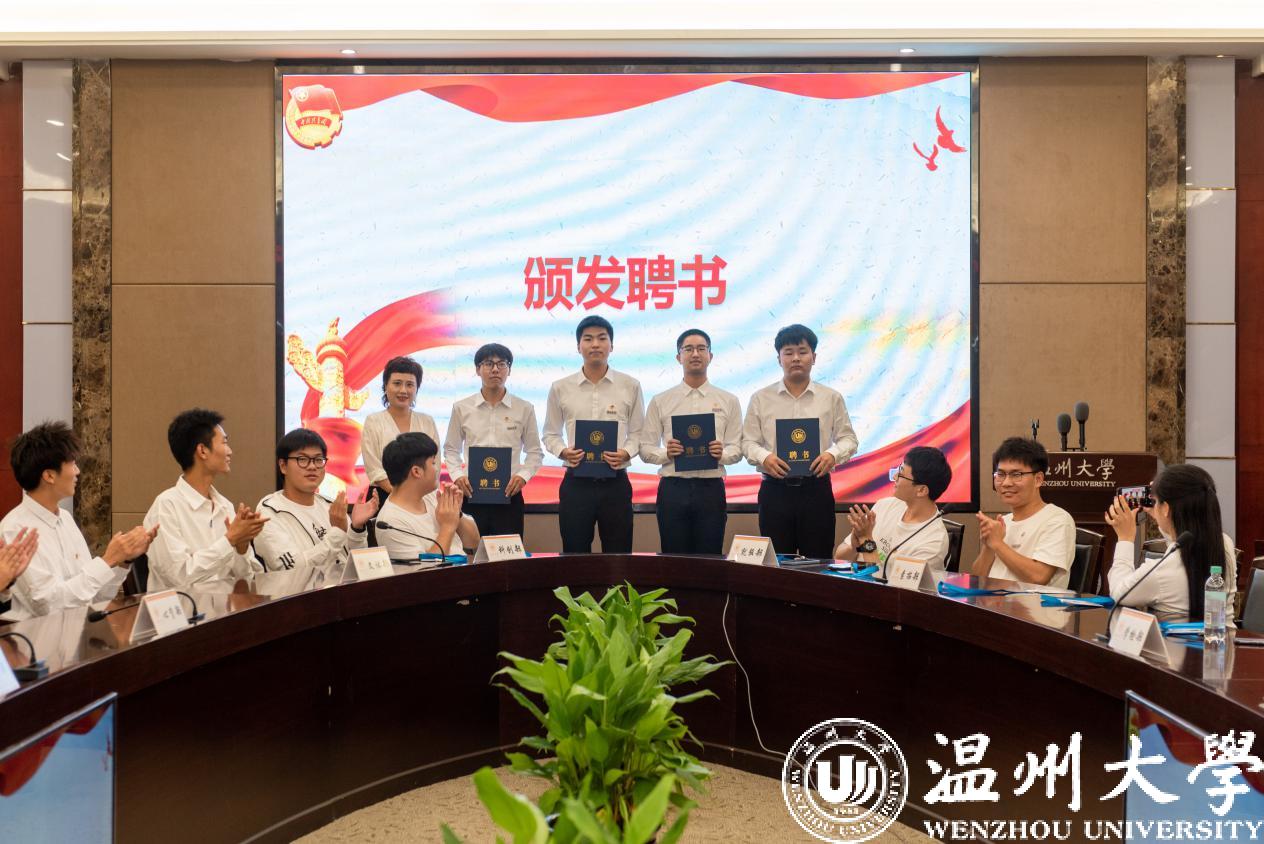 第六项议程,由院党委副书记黄玮老师、团委书记杨奇老师、辅导员史凤娟老师、刘言君老师为新一届主席团成员和各部门部长颁发聘书,祝贺他们选择留任团委·学生会,开启新的人生征程,收获成长的喜悦。
