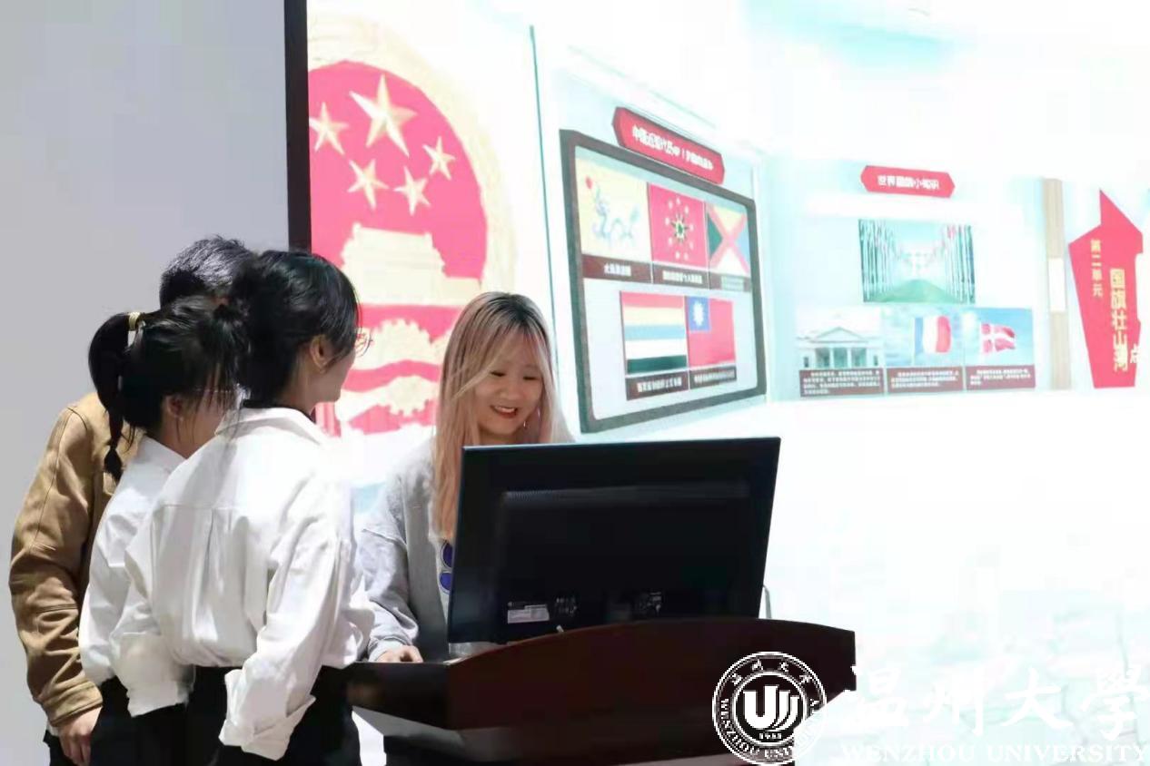 随后,为进一步增强广大党员同志的体验感,教育基地指导老师演示了虚拟板块的基本操作。本虚拟板块主要包括“走进马克思”、“中流砥柱”、“五星红旗”、“一带一路”等专题内容,可在虚拟仿真课堂中通过视频学习、交流互动、答题闯关等方式学习知识、场景体验。通过视频展示,讲解了关于五星红旗背后的故事。并且邀请研究生第一党支部书记姚旭凯体验制作国旗,本科生第二党支部书记黎雯婧感受虚拟场景的移动与知识竞答。这一全新的沉浸式的学习方式给在场党员同志不同于课堂上的感受,身临其境般感悟历史,提高了思政课的时代感和吸引力。