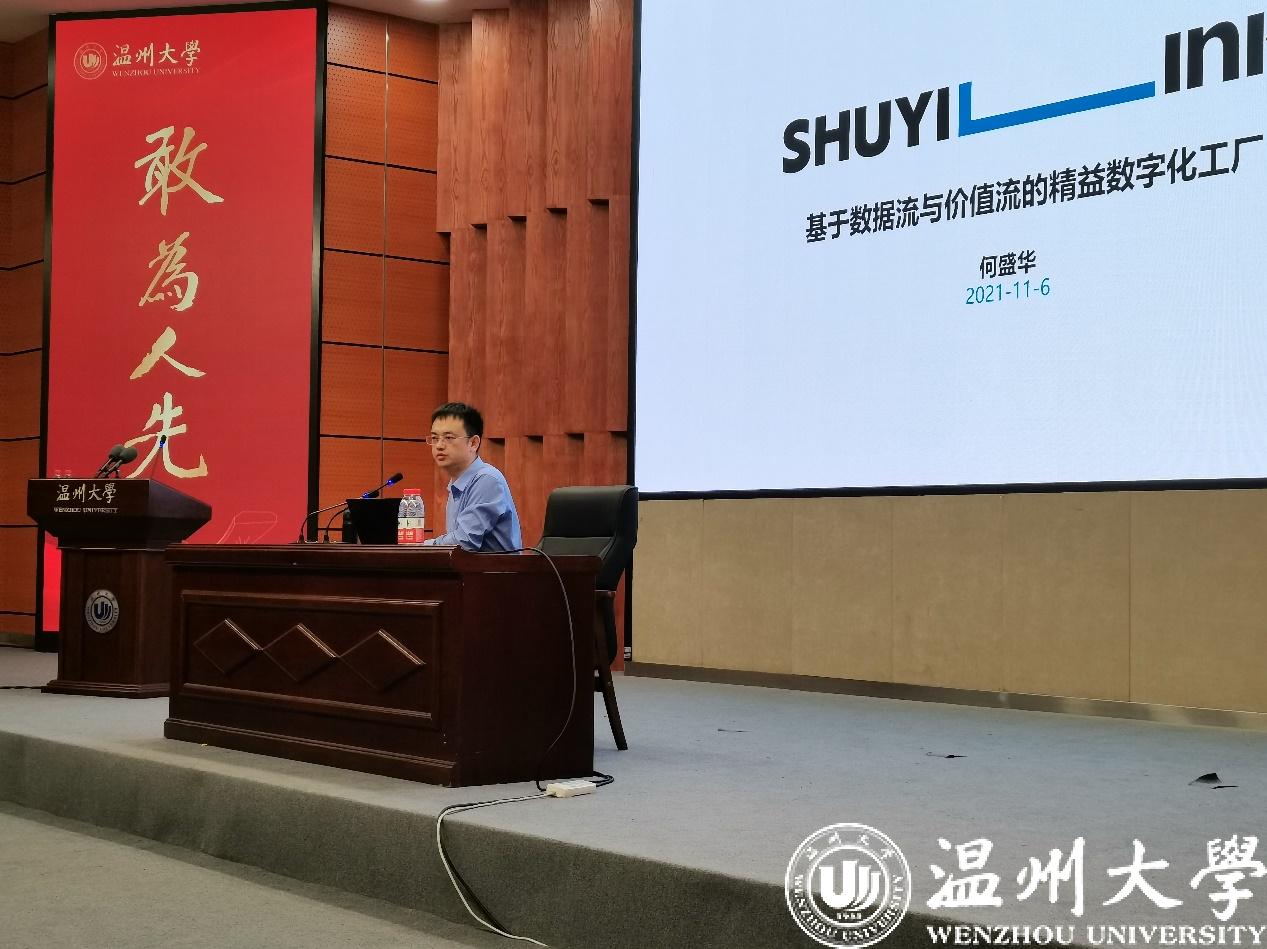 紧接着,由何盛华先生做出工业工程在现代企业运用的讲座分享,何先生先向同学们分享的自己的工作经历,从中强调了互联网时代智能制造与数字化的重要性,用工业的历史发展为同学们举例,使同学们明白了工业工程在未来可以凭借其系统性的考虑,运用合理的技术,达到降低成本,提高质量的目的。同时何先生也介绍了数益工联团队研发的基于数据流与价值流的精益数字化工厂,让同学们了解到了前沿工厂的先进技术。最后,何先生也向同学们介绍了自己的宁波数益工联科技有限公司,欢迎同学们今后前去实习应聘。在何先生的精彩发言之后,同学们响起了热烈的掌声。