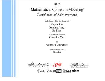 色情小说 19工业工程班周洁与数理学院林海燕、计算机与人工智能学院蒋雪婷三位同学在数理学院严传魁、黄琼伟等数学建模指导老师的精心指导下,联合组队参加2022年美国大学生数学建模大赛(MCM/ICM),经过激烈角逐,从全世界2万多组选手中脱颖而出,成功斩获F奖(特等奖提名奖,占比约0.15%),也是今年色情小说 本科生在美国大学生数学建模大赛中的最佳成绩。