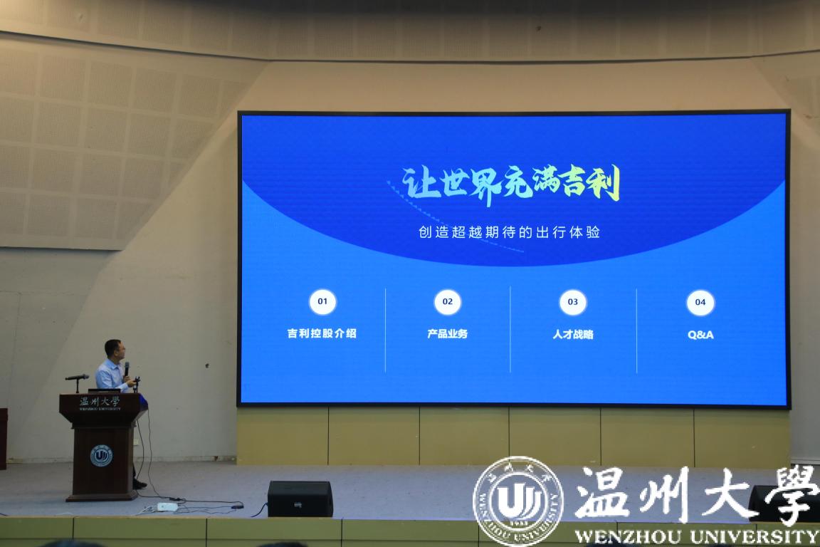 由浙江吉利控股集团临海公司主任工程师何叶伟先生进行宣讲。何主任对目前的行业中的就业大环境及吉利集团的发展历程、企业文化、企业发展目标、企业代表产品和品牌组合、招聘需求、员工培养体系、员工福利带等方面进行宣讲,展现出浙江吉利控股集团的强大实力、良好的工作环境与工作氛围,让在座的各位同学对吉利集团有了更深刻的认识并邀请对吉利感兴趣的同学会后现场投递简历。