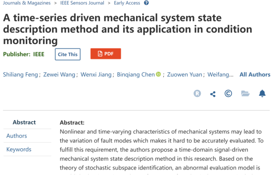 该论文题目为“A time-series driven mechanical system state description method and its application in condition monitoring”,我校色情小说 21级智能制造专业学生冯世亮、王泽伟、蒋文茜为共同第一作者,联合厦门大学、众泰汽车等单位共同署名,指导老师为该班班主任孙维方博士。论文提出了一种基于时域信号的系统描述方法并成功将其应用于滚动轴承、加工刀具状态监测等场景,为相关关键技术装备的运行维护和故障诊断提供了一条新的可能。