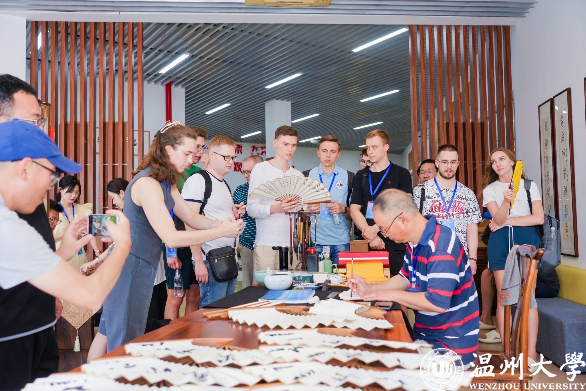 下午,代表们来到温州院士楹联博物馆。浓厚的文化底蕴和书法艺术的魅力,让俄罗斯青年代表们沉醉其中。馆方还准备了一份特别的礼物,将书写着象征中俄友谊的扇子,赠送给俄罗斯青年代表团。大家对这些书法作品表现出极大的兴趣,纷纷拍照留念。