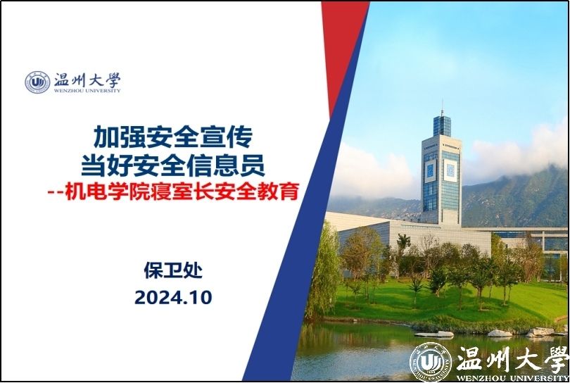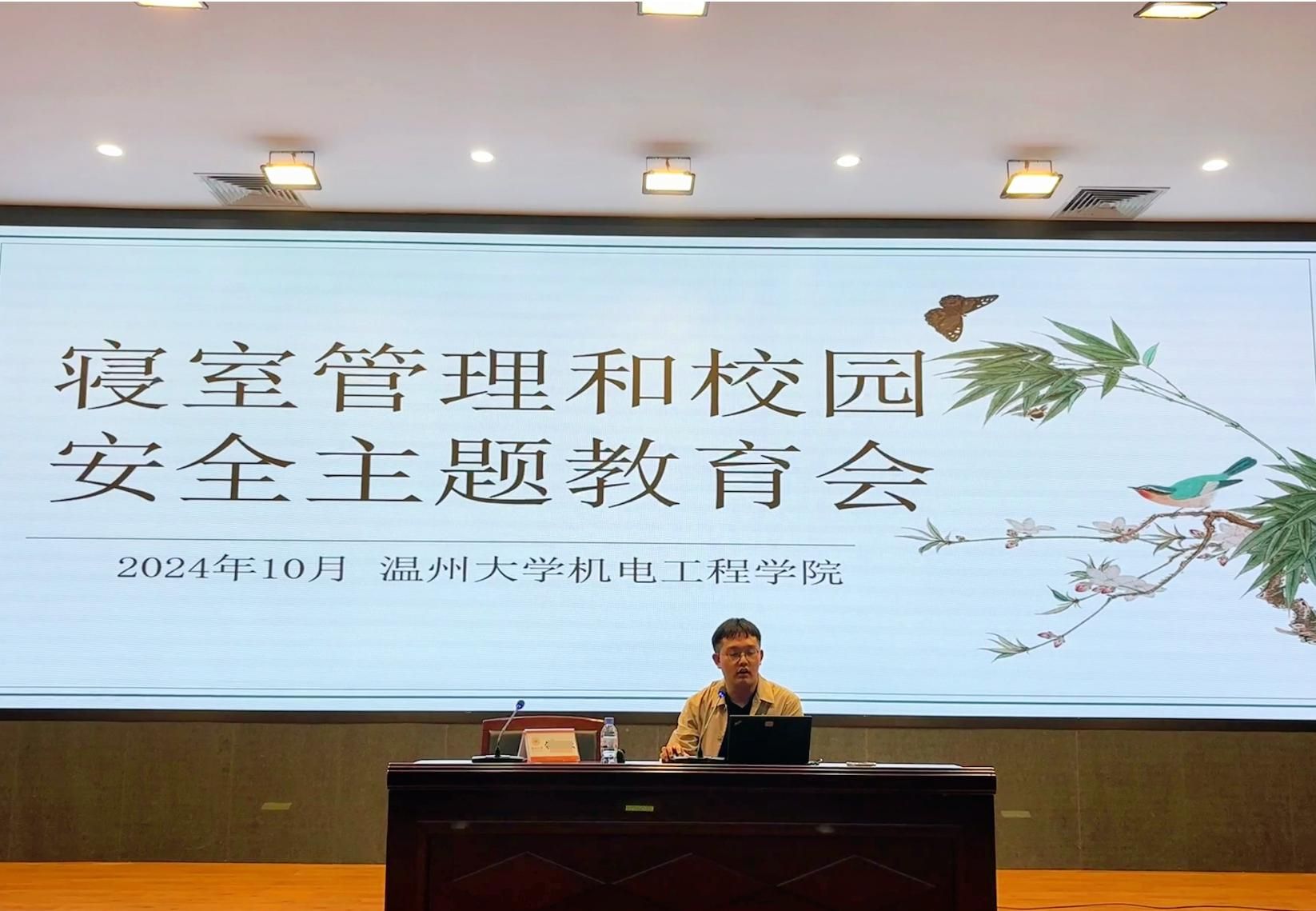 第一项,钱合激老师介绍并强调校园寝室安全工作。首先,介绍了寝室中常见的安全问题,提醒机电学子要关注消防隐患和交通安全,杜绝起火事件发生,保护个人出行与身体安全。其次,介绍寝室长的工作职责、强调寝室长要怀有三大安全理念和五大安全能力,密切关注寝室潜在的隐患,起到寝室成员之间良好的沟通职能,履行好寝室长的职责。然后,介绍学校5A校园创建工作进展,引导学生树立安全常识,增强全体学生安全感,为争创5A校园贡献机电学子力量。最后,提出几点注意事项,加深学生认识,呼吁大家关注自己平安、关注寝室平安、关注校园平安。