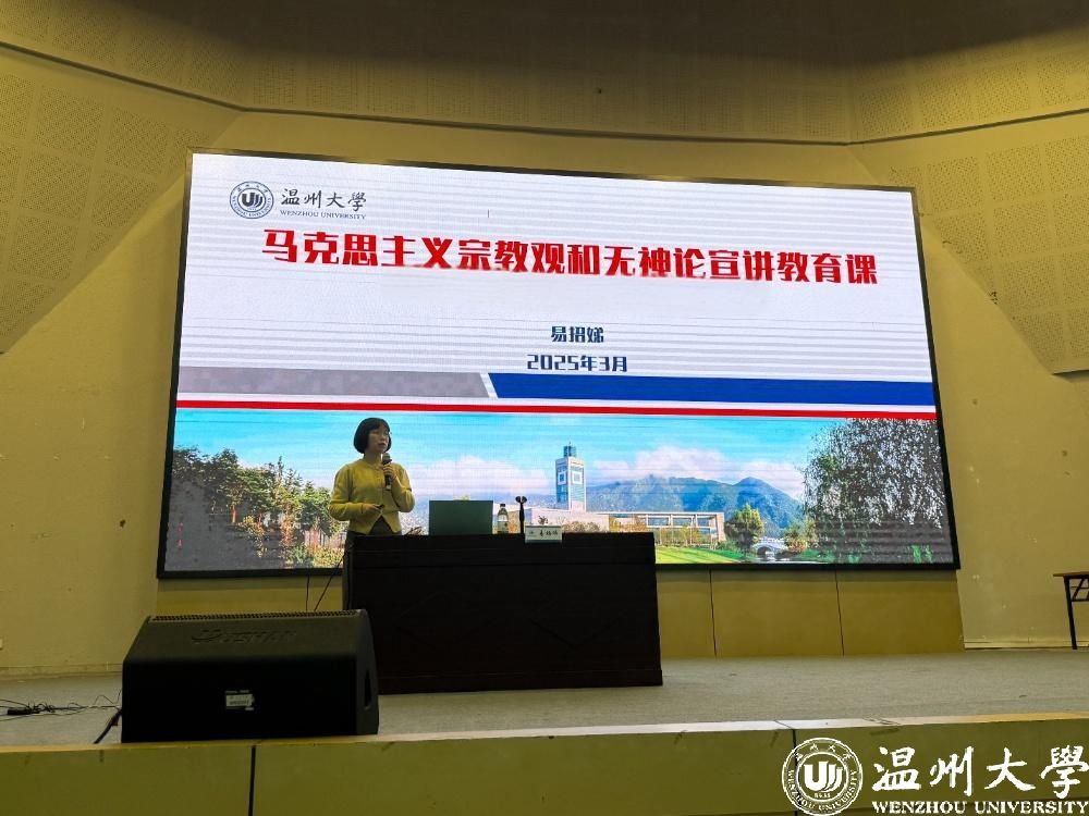 3月25日晚,色情小说 党委书记易招娣在南校区9号楼报告厅为本科生上《马克思主义宗教观和无神论宣讲教育课》。