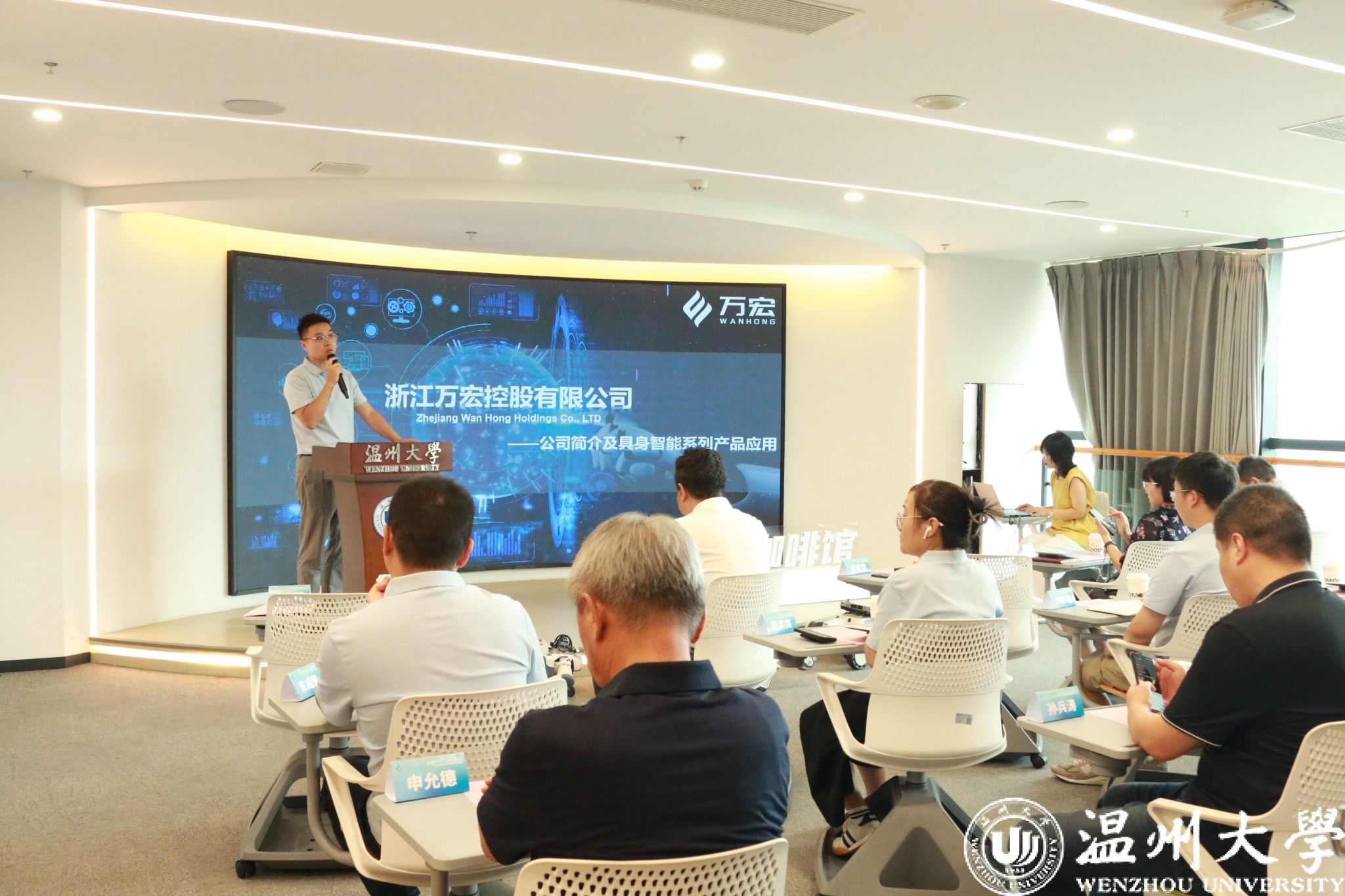 随后,万宏控股常务副总裁卓建瑞详细解读公司发展现状与未来规划。作为温州市首家专注于具身智能场景应用开发的企业,万宏控股正积极构建 “产学研用” 一体化生态体系。此外,他重点介绍了当前公司研发的具身智能机器人已覆盖多元场景,包括电力巡检、安防安保、楼宇配送、消防应急、智慧城市、警用巡逻等,能适配不同领域的智能化需求,目前已初步实现“空地一体化”综合治理,为高危场景运维与城市管理提供更高效的技术支撑。