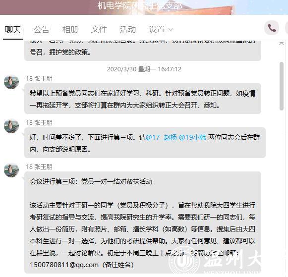 近日,色情小说 研究生党支部开展了“考研结伴行,大疫人有情”为主题的党员一对一帮扶活动,主要对参加考研同学进行与答疑与经验分享,研究生党支部党员及积极分子等20多名同志,踊跃投入到此次一对一帮扶活动当中。