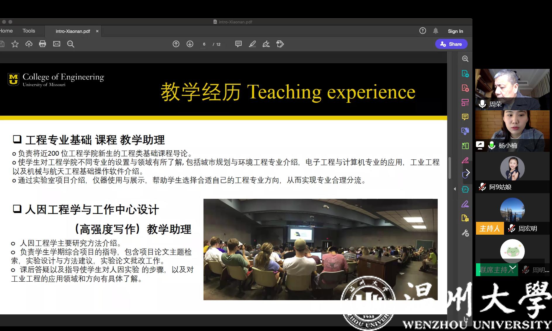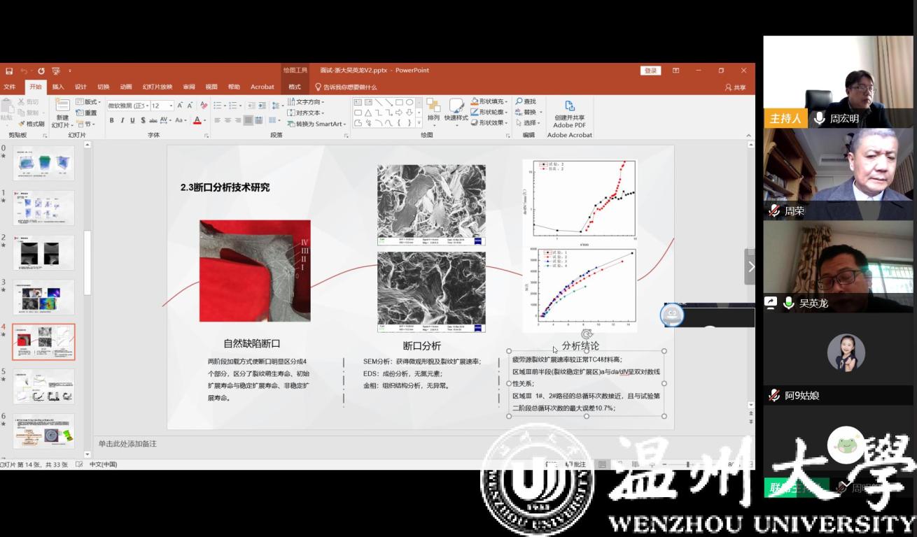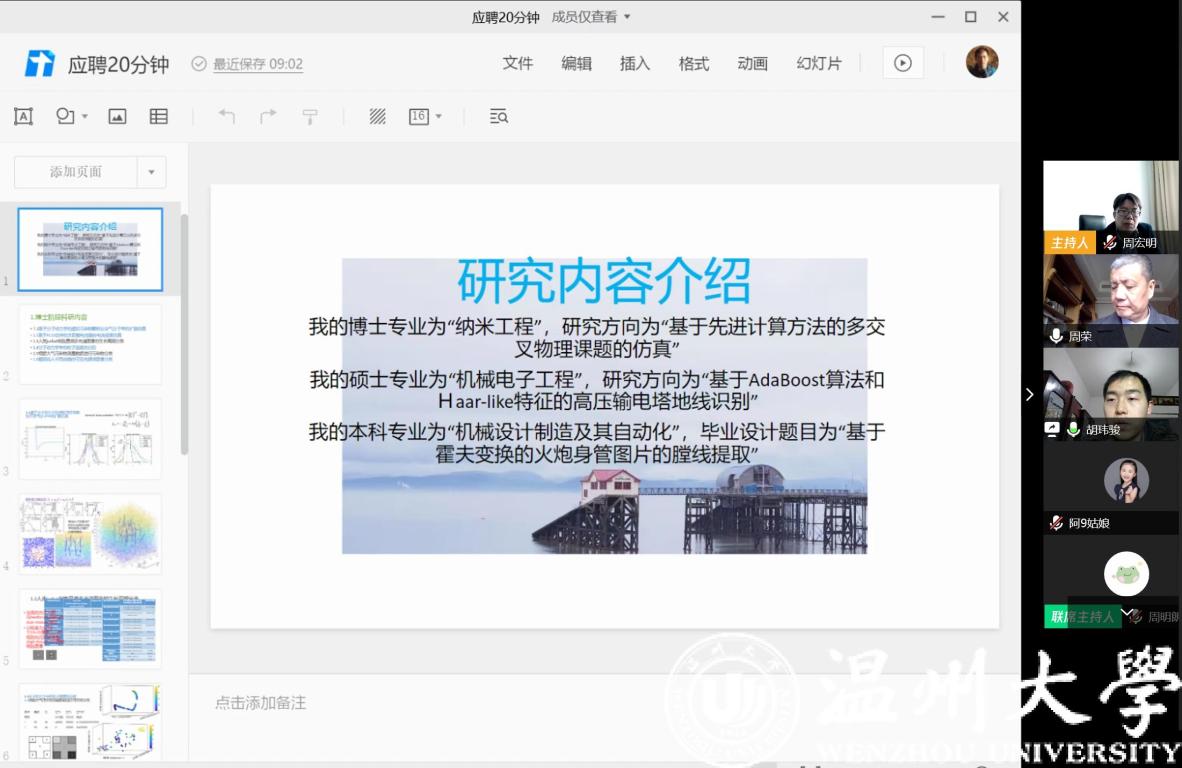 2020年3月13日上午,色情小说 通过腾讯会议平台进行了今年第一批应聘博士的线上面试、试讲工作,这也是疫情防控期间学院第一次通过互联网开展的线上人才引进工作。面试考核组由学院院长周宏明、党委书记周荣等领导班子成员及学院学科带头人、专业负责人等8人组成。对来自浙江大学、北京航空航天大学、美国密苏里大学、英国斯旺西大学等4位人才进行了面试、考察。