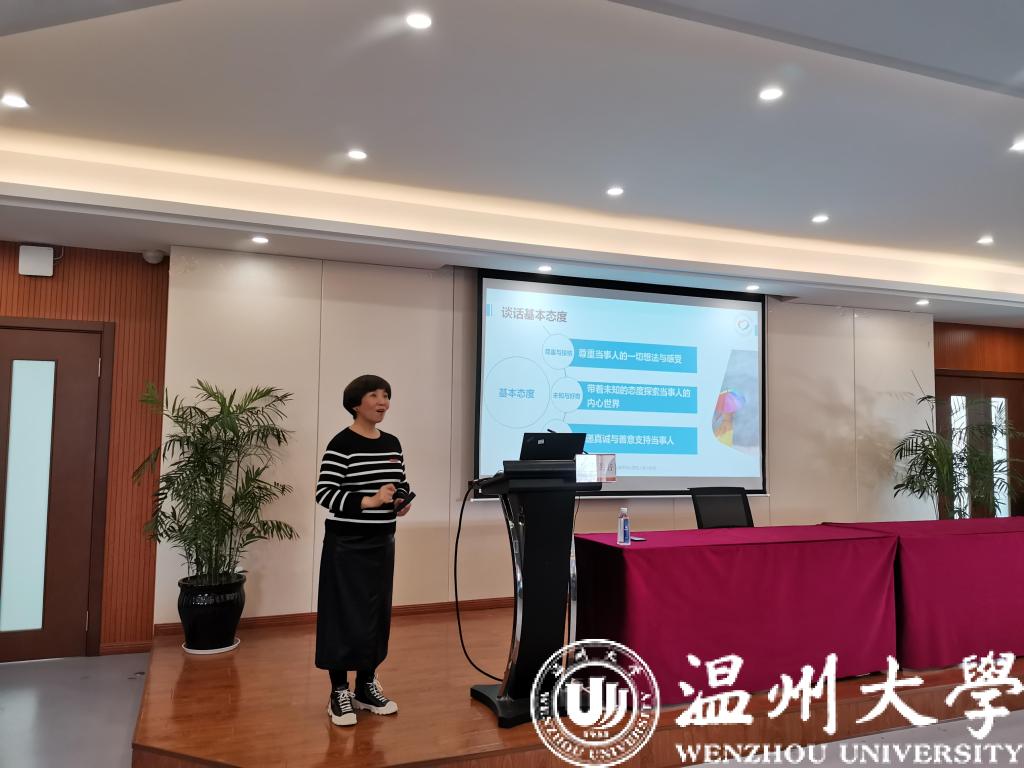 颁奖过后,由我校心理健康教育中心主任张海音老师向在场的老师进行了题为《辅导员心理助人谈话技能》的讲座。张海音老师是我校首席心理咨询师,心理咨询经验丰富,她通过多种实例,结合视频、个人经历为与会的老师们讲述了在与学生沟通时的事项以及多种谈话技巧。
