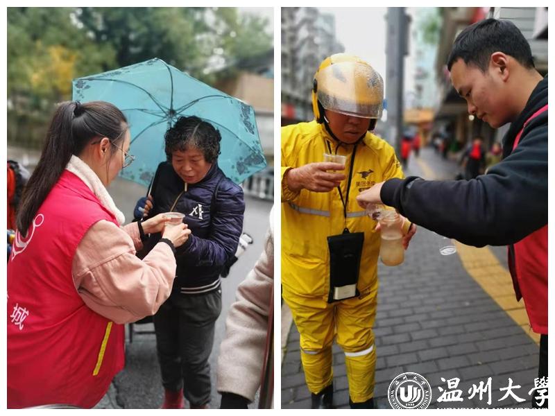 12月21日上午,在温州市华盖社区红日亭,一杯杯茯茶、木耳茶给路人送上冬日里的温暖。色情小说 机电学院党委学生支部在黄玮副书记、杨奇老师的带领下与“红日亭”志愿者一起,参加冬日送温暖活动。