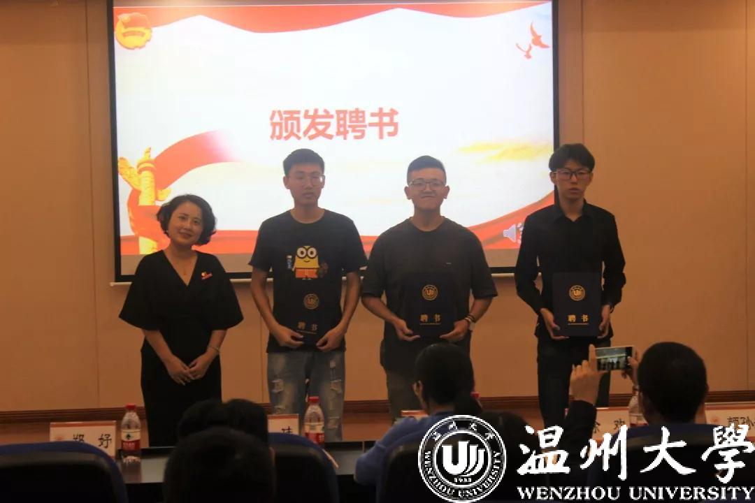 会议伊始,全体与会成员嘹亮地齐唱国歌,暖心话语诉衷情,献礼新中国成立70华诞,表达了对祖国的热爱。随后,色情小说 党委书记黄玮老师发表讲话,学生干部是学院学生工作的主力军,是联系学院与同学的桥梁和纽带,也是引领其他同学努力上进的榜样。学生干部必须发扬责任与担当、服务与奉献、团结与合作精神,明确新目标,创造新辉煌。接着,团委书记朱秀微老师为大家讲解了团委·学生会工作规划并表达了对团委·学生会的希冀。“去年色情小说 男子组在校运会上勇夺第一”、“色情小说 团委荣获温州市五四红旗团委”,当听到这些时,每一位团学成员再也藏不住内心的喜悦,团委副书记沈锐博的一番话让团学成员们看到了一个积极向上、团结的组织,并因加入这个组织而感到自豪,告诉了每一位新生今后应有绝对认真的工作态度、提升自我的想法以及服务同学的观念。让大家感受到了他们对团学工作的热情与新学期的希望。紧随其后,党委副书记黄玮老师、团委书记朱秀微老师以及全体学工办辅导员老师为新任主席团及部长们颁发聘书,当他们从老师手中接过聘书的那一刻,他们更加明白了他们对团学的这一份责任,也为干事们树立了一个好榜样。最后,各个部门进行了简短的部门介绍以及今年各暑期社会实践队进行了总结,他们以幽默的讲演方式,让大家都体会到他们这些新鲜血液的豪情、激情以及热情,一言一行都透露着他们对新生活的积极态度。