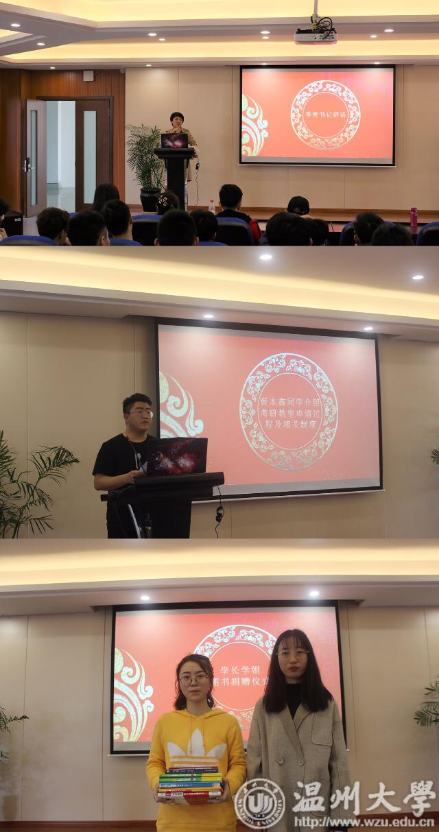 在图书捐赠这股暖流之后,李密副书记做总结发言,她强调考研的意义,考研是最优质的就业, 既能服务社会又能为自身带来新的发展,使人生踏上新的台阶。随后带领大家一起回顾了历年的考研情况,激励着新一届的考研同学们能够披荆斩棘,再创佳绩。她说:“考研需要同学们从现在开始制定计划、明确目标、调整好心态。考研是一个注定不会一帆风顺的过程,只有意志坚强,才能到达成功的彼岸。”李密书记希望大家珍惜这次来之不易的机会,形成积极向上的考研氛围,让大家彼此鼓励,相互帮助,共赴考研这一征程。
