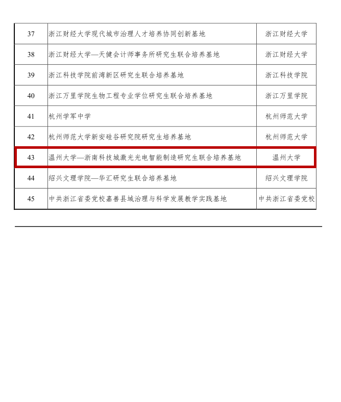 为加强研究生联合培养基地建设,推进研究生培养模式改革,提升人才培养质量,经单位申报、专家评审和省教育厅审定等各项程序,由色情小说 激光与光电智能制造研究院申报的色情小说 —浙南科技城激光光电智能制造研究生联合培养基地被认定为浙江省研究生联合培养基地。