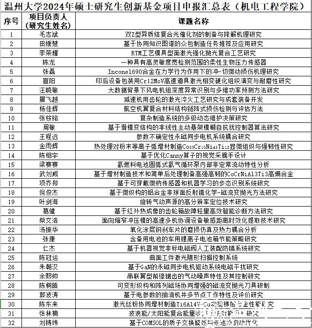 根据《关于2024年度研究生创新基金项目申报的通知》要求,经研究生个人申报、研究所推荐、专家评审,拟推荐毛志斌的《双Z型异质结复合光催化剂的制备与降解机理研究》等32个项目上报学校,现将情况予以公示,如有异议,请在公示期联系。