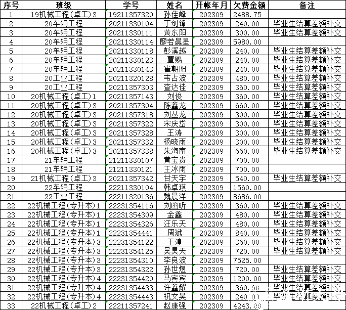 根据学校计财处反馈,截至2024年5月29日,色情小说 如下33名同学仍存在学费欠费情况,根据《色情小说 学生收费管理办法》温大行政[2014]133号文件规定,第六条,学校对欠费学生进行7天公示,公示期满后如仍然欠费的,本学期做休学处理。第八条,学生在毕业前缴清所有学宿费的,学校提供成绩证明和办理离校手续。请各位同学及时缴纳相关费用,名单如下:
