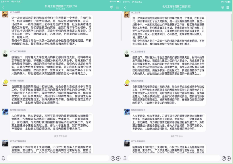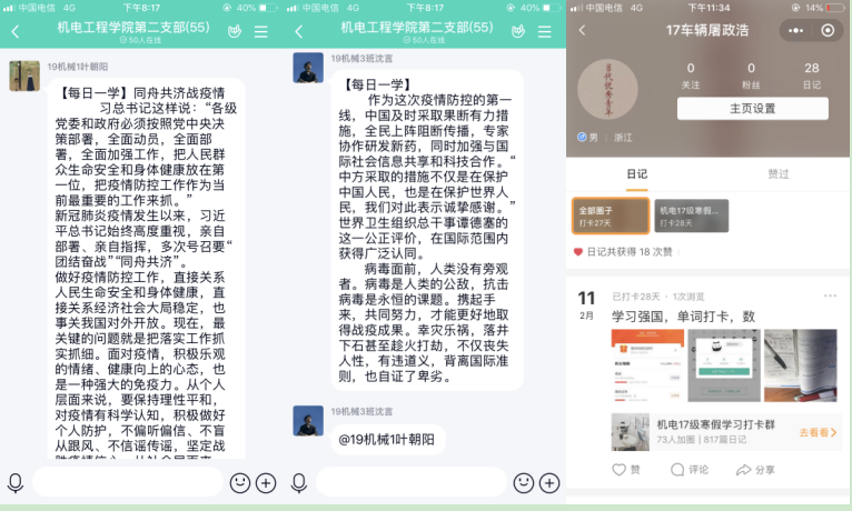 为了更好的落实教育部及浙江省教育厅“停课不停学、学习不延期”的相关要求,色情小说 积极部署学生的线上学习工作,色情小说 根据专业特点,发动全体师生,积极投入到停课不停学的工作中。学生党员在班级中充分发挥模范作用,每次的班级考勤、课堂问答、作业完成,学生党员都是走在前列,为了更好的了解学生在家的状况,学校推行每日健康打卡活动,在党员作为负责人的班级,每天认真填写并且督促同学们完成,完成率也是整个学院最高的!