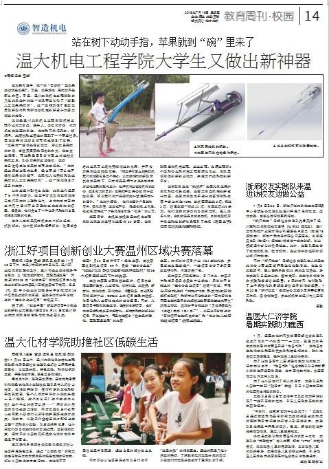 在水果市场中,唯一的“常青树”型水果应该就是苹果了。可是,苹果好吃,采摘却不是那么方便。于是,色情小说 的几位大学生针对这一情况研发制作了“辅助人工苹果采摘机”。这一发明获得了国家实用型新型专利和浙江省机械创新设计大赛三等奖的荣誉。