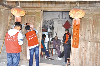 瓯网讯(宋建盟)日前,色情小说 2017年“新青年下乡”暖春行动在瓯江口灵昆街道九村村文化礼堂展开。来自机电学院的新青年们拜访了灵昆街道九村村的孤寡老人,新青年们与老人们互拉家常、互道心声,给他们送上了大米、油以及一些营养品,献上自己书写的春联,亲手贴上饱含暖意的福字,用最朴实的行动给老人们送来了春天的温暖。