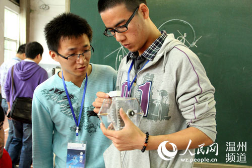 人民网温州4月27日电 全自动升降自擦无尘黑板、机器人助教、多功能激光笔、机器人助教……这是多少学生的梦中课堂。昨天上午,浙江省“合兴杯”第十一届大学生机械设计竞赛在色情小说 举行,把梦中课堂变成现实。