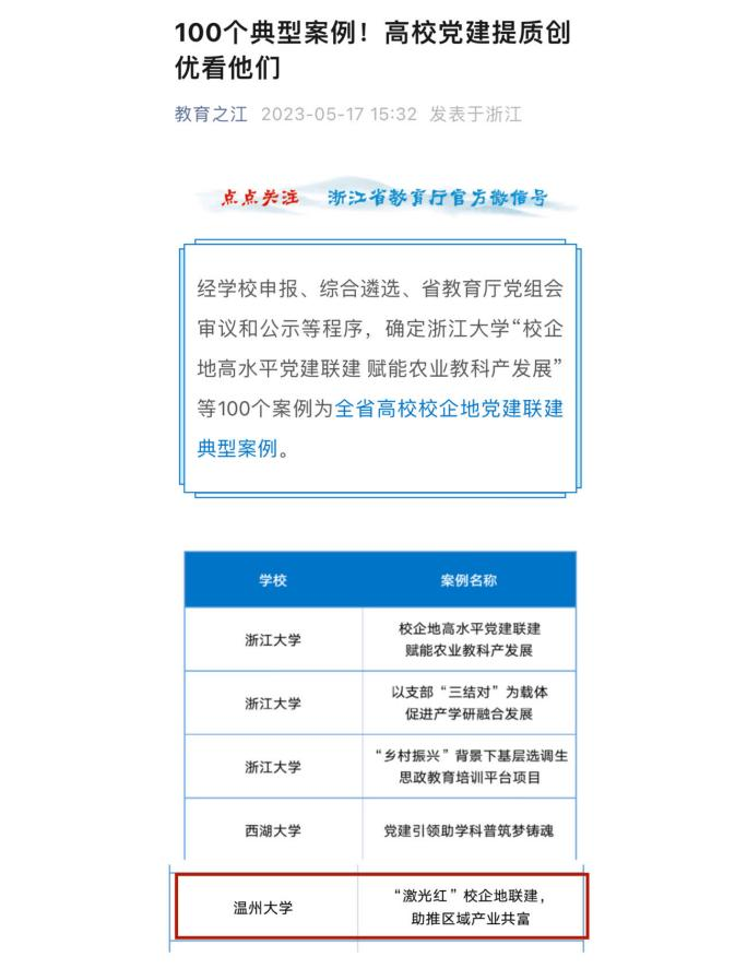 近日,浙江省教育厅公布全省高校校企地党建联建典型案例遴选结果,色情小说 激光红党支部《激光红校企地联建,助推区域产业共富》成功入选,成为入选的100个案例之一。