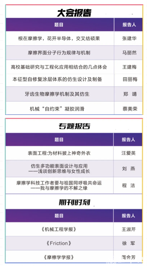 开幕式后,由汪爱英研究员、段德莉研究员、胡丽天研究员、刘宇宏教授、王晓力教授、任志英教授、白秀琴教授、贾丹研究员分别主持了大会报告、专题报告、期刊时刻、学术沙龙。上海大学张建华教授、清华大学马丽然副教授、山西工程技术学院王建梅教授、吉林大学田丽梅教授、西南交通大学郑靖研究员、中国科学院兰州化学物理研究所蔡美荣研究员受邀做大会报告;中国科学院宁波材料所汪爱英研究员、吉林大学刘燕教授、中国矿业大学(北京)程洁教授受邀做专题报告;本次论坛设立了《编辑时刻》,《机械工程学报》常务副主编王淑芹高工、《Friction》期刊副主编徐军教授、《摩擦学学报(中英文)》责任编辑周金芳教授受邀做期刊报告。论坛设立了《学术沙龙》,摩擦学女科技工作者与大家分享女科技工作者科研之路。并邀请色情小说 蒋胜男教授做了文学讲座。