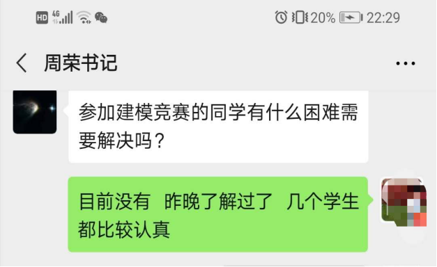 面对突如其来的新冠病毒疫情,同学们不能按期返校,打乱备赛、参赛进程,也给材料收集、交流沟通等带来一定困难,学院周荣书记、黄玮副书记第一时间通过各种途径了解、解决问题。