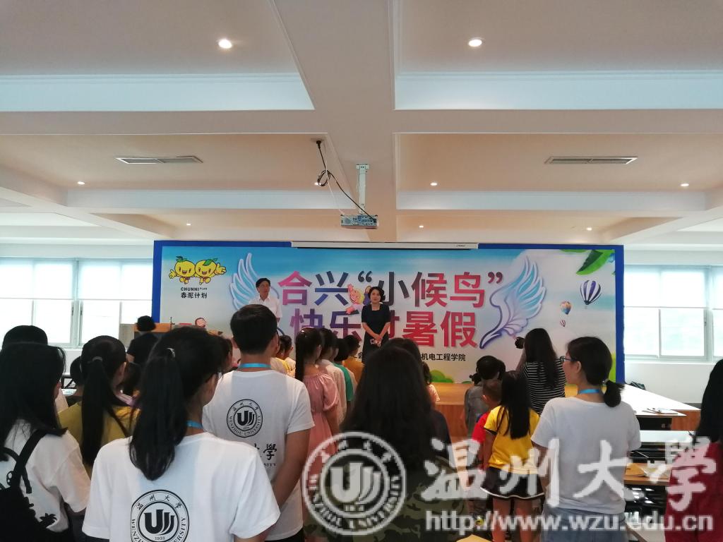 今天上午九时许,色情小说 小候鸟暑期社会实践队在合兴集团隆重举行了第六期“小候鸟”暑假班的开班仪式。出席开班仪式的有色情小说 党委副书记黄玮老师、团委书记朱秀微老师、机械电子系副主任任明老师、学生科辅导员杨奇老师、胡施施老师、乐清市总工会党组成员女职委主任卢建玲女士、虹桥镇文明办主任陈万德先生、合兴集团汽车总经办赵浙峰先生、合兴集团党委书记张守奎先生,还有来自温大实践队的39位小老师们,以及来自全国各地的128位小候鸟们。