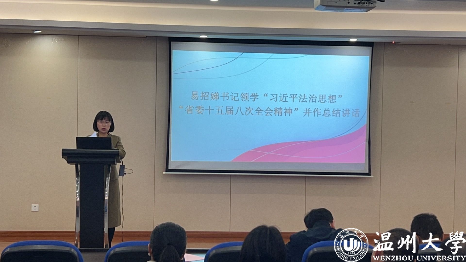 易招娣带领全体教职工深入学习“习近平法治思想”与“省委十五届八次全会精神”。她指出,习近平法治思想是新时代推进全面依法治国的根本遵循,省委全会精神为我省下一阶段发展指明了方向路径,全体教职工要深入领会其核心要义与实践要求.要将学习贯彻习近平法治思想与省委全会精神作为当前重要政治任务,与学院中心工作深度融合。她要求各系所、党支部组织开展专题学习,引导教师把学习成果转化为推动学科建设、人才培养和科技创新的实际行动;全体教师深刻把握其重大意义与实践要求,将学习成果转化为推动学院发展的强大动力,以更高标准落实立德树人根本任务,为谱写中国式现代化浙江新篇章贡献机电学院的智慧和力量。