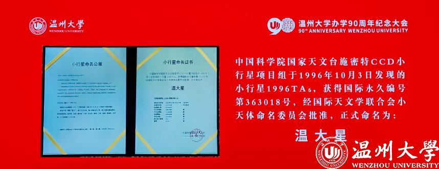 随着巡天观测研究团组首席研究员薛随建宣读“温大星”命名公报和命名证书,经国际天文学联合会小天体命名委员会批准,国际永久编号第363018号小行星命名为“温大星”。